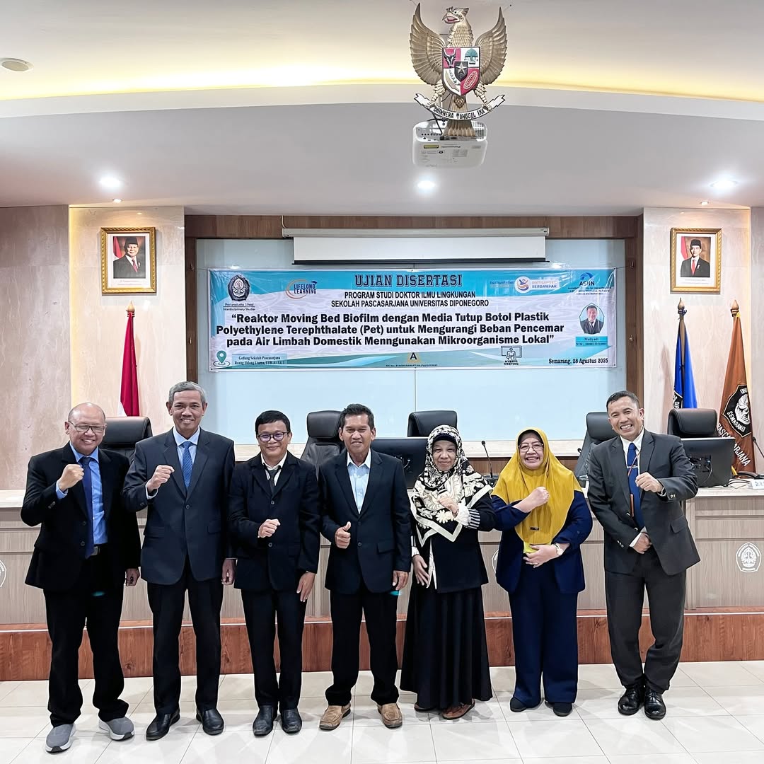 Telah berlangsung hari ini Ujian Disertasi mahasiswa Doktor Ilmu Lingkungan Sekolah Pascasarjana Undip a.n. Muliyadi dengan judul disertasi “Reaktor Moving Bed Biofilm dengan Media Tutup Botol Plastik untuk Mengurangi Beban Pencemar pada Air Limbah Domestik Menggunakan Mikroorganisme Lokal.”