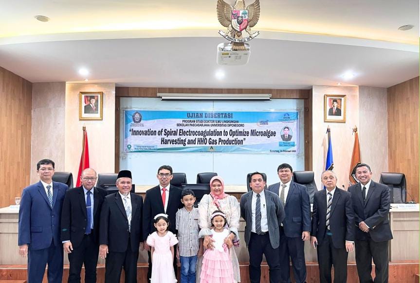 Telah berlangsung hari ini, 24 Febuari 2025 Pukul 09.00 – 11.00 Ujian Disertasi mahasiswa Doktor Ilmu Lingkungan Sekolah Pascasarjana Undip a.n. Purwono dengan judul disertasi “Innovation of Spiral Electrocoagulation to Optimize Microalgae Harvesting and HHO Gas Production.”